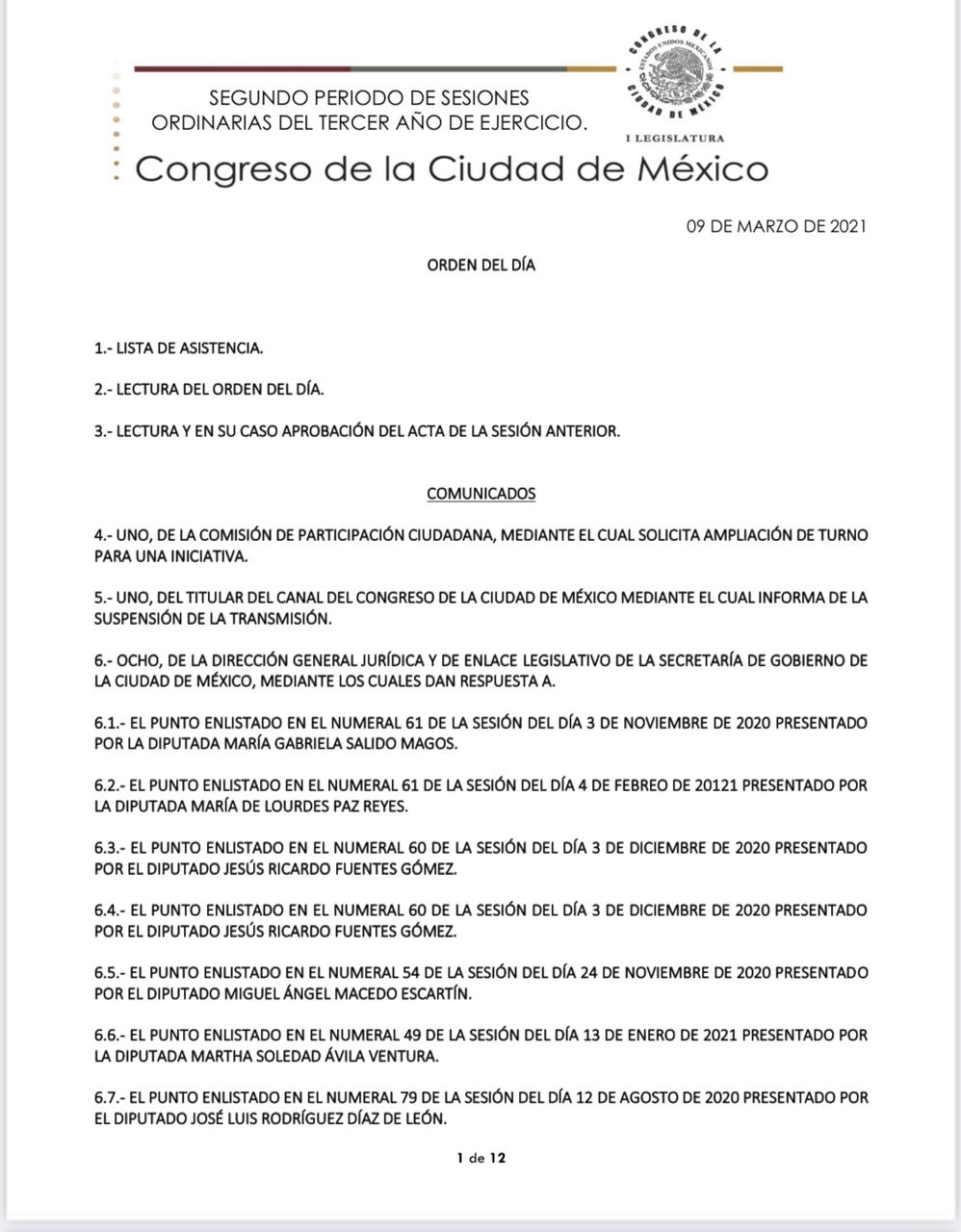 Sesión Ordinaria del Congreso de la Ciudad de México, 9 de marzo de 2021.